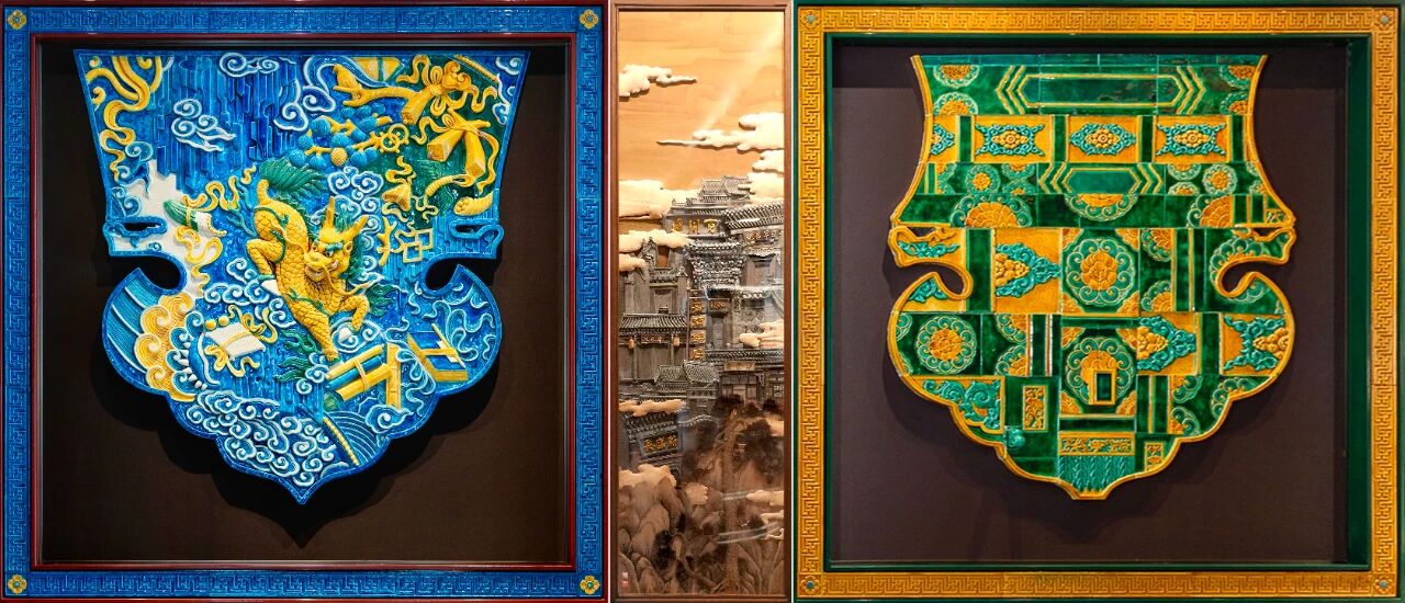 左右琉璃作品《万事如意》;中间长治堆锦作品《汇通天下》