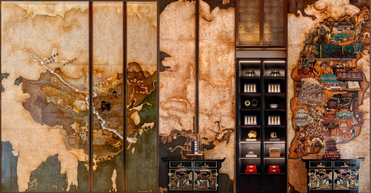 这里更堪称“非遗技艺的活态展馆”。国家级非遗传承人薛生金祖孙三代耗时三年精制的两幅推光漆画镇馆之作:《万里茶路》巧妙融入古道砂石,诉说着晋商跨越亚欧的壮举;《锦绣晋境》以三晋版图为轴,串联起云冈石窟、晋祠、鹳雀楼等地标,呈现一部微缩的文旅史诗。长治堆锦《汇通天下》以千块丝绸构件演绎票号密码,潞绸与棉花的融合,闪耀着“日昇昌”的金融智慧;介休琉璃《万事如意》以瑞兽麒麟、琴棋书画八宝纹样,将“琉璃之乡”的千年窑火,淬炼成寓意深远的吉祥图腾。